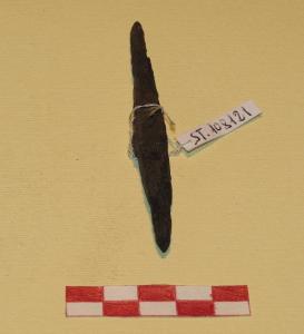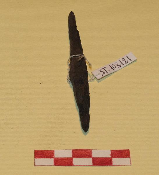 Punta di freccia in ferro di forma ogivale, a sezione quadrangolare. Lungh. cm 8,2; spess. max cm 0,7. Datazione: IV secolo d.C. Provenienza: Acquafredda (BS), campo Cappella, ricerche di superficie (consegna del Sig. Graziano Fanelli).