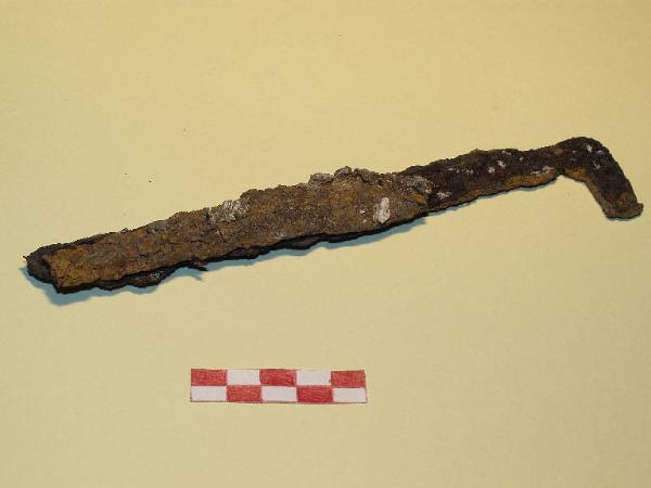 Coltello frammentario in ferro. Lama di forma triangolare, codolo ricurvo. Corroso e fortemente incrostato.