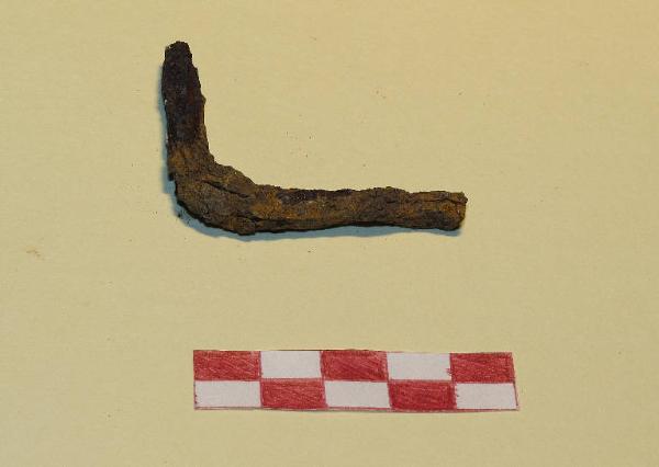 Frammento di cavicchio in ferro con barra a sezione quadrangolare. Corroso e fortemente incrostato.
