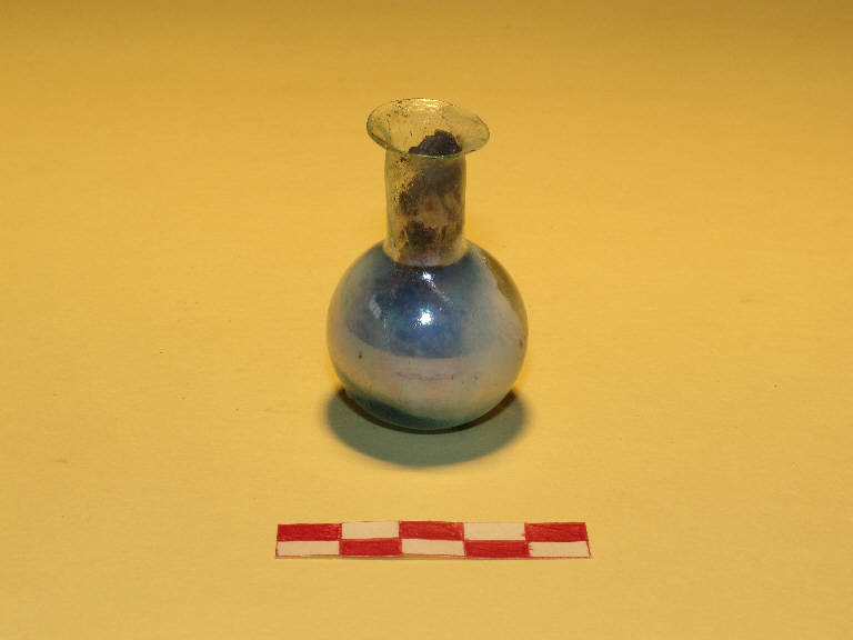 Balsamario in vetro a corpo globulate di tipo Isings 6. Vetro naturale, incolore.