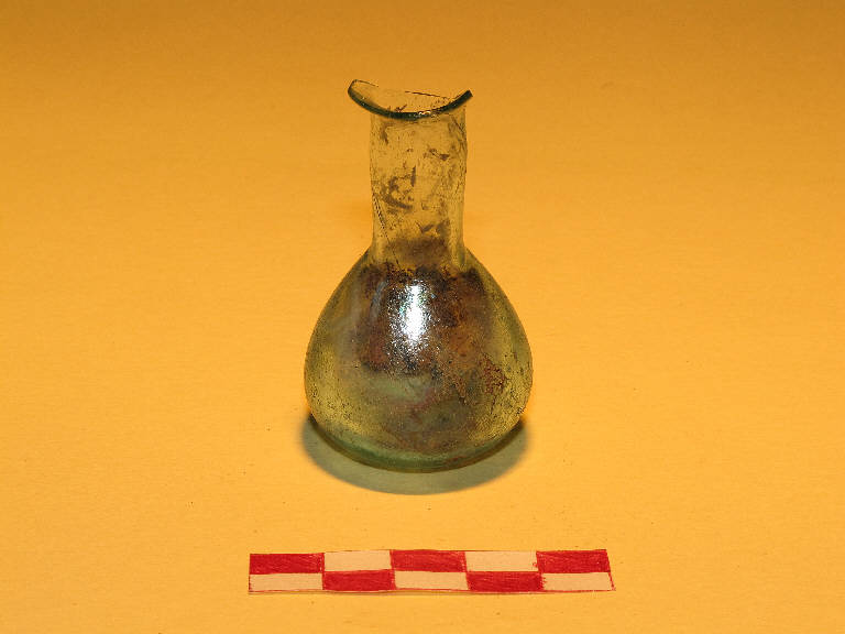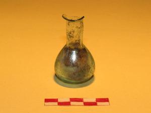 Balsamario in vetro tipo Isings 8. Incolore, trasparente. Lacunoso dell'orlo.