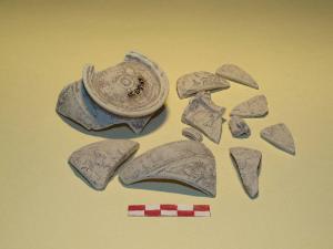 Frammenti di fondo e parete di skyphos in ceramica invetriata di prima età imperiale. Ringhenkelskyphos !A. ecorazione a matrice con tralci di vite. Corpo ceramico depurato di colre beige, invetriatura giallastra.