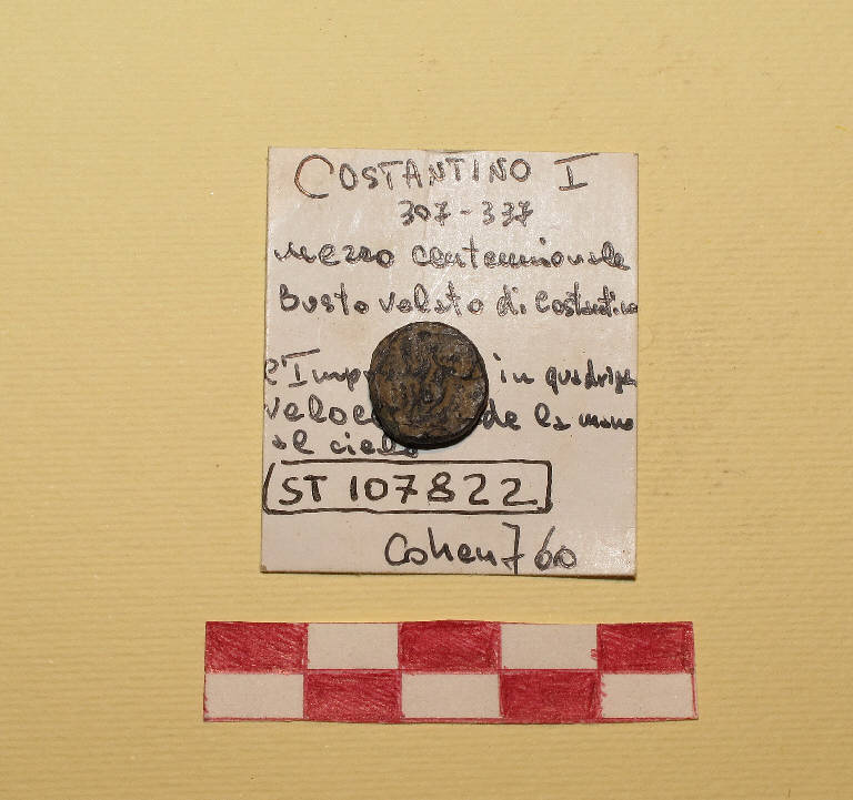 Mezzo centenionale in bronzo di Costantino I.\nD/ busto velato dell'imperatore\nR/ l'imperatore sulla quadriga