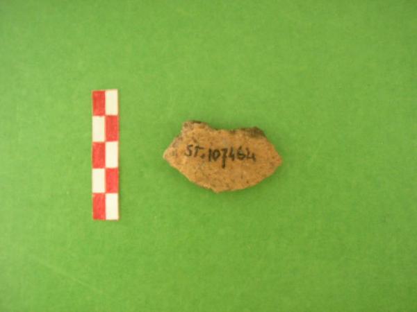 fr. di parete di vaso, terracotta grossolana di colore arancio all'esterno e grigio scuro all'interno.