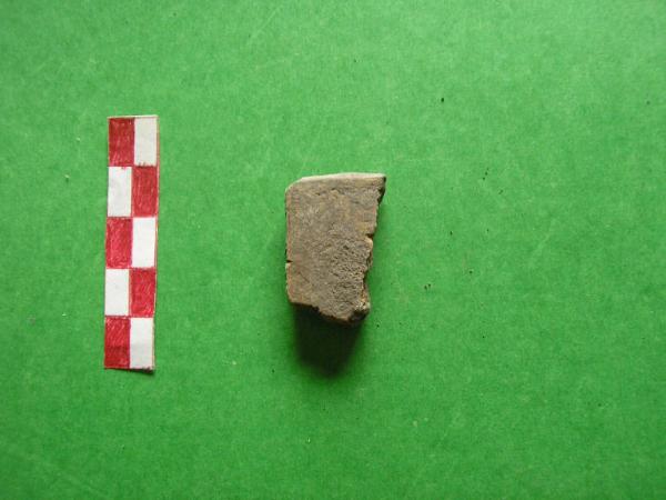 fr. di parete di vaso, terracotta grossolana di colore arancio all'esterno e grigio scuro all'interno.