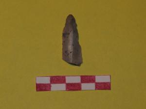 Becco a sezione triangolare su lama in selce di colore grigio chiaro. Ritocco destro dorsale marginale distale; sinistro ventrale. L'estremità distale è caratterizzata da ritocco coprente su entrambe le facce.