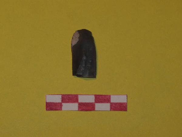 Grattatoio frontale. Selce di colore grigio scuro, con residui di cortice vicino all'estremità distale. Sezione lenticolare