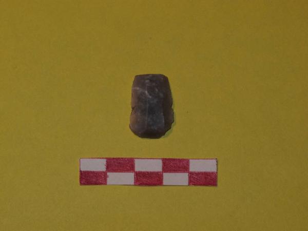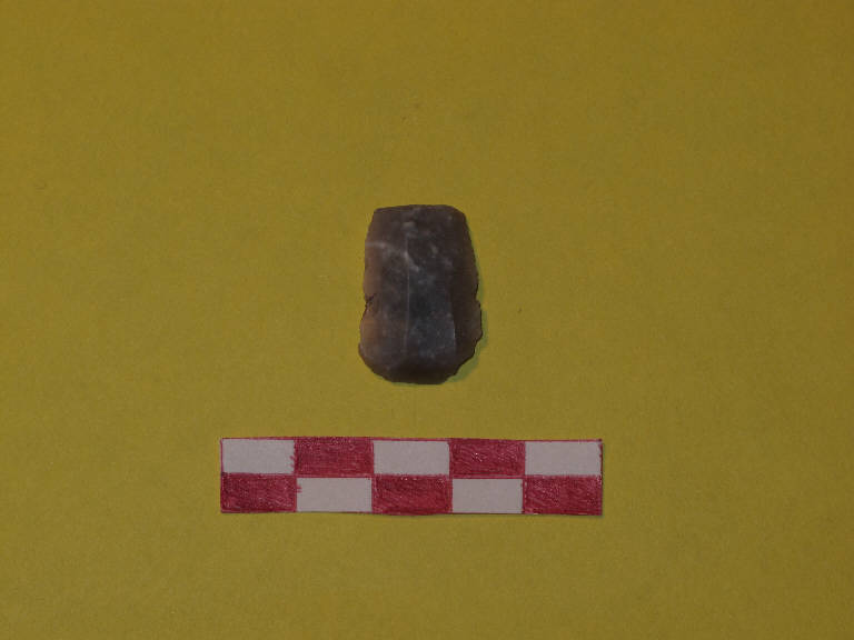 Grattatoio frontale in selce di colore grigio chiaro con floculi bianchi. Sezione trapezoidale.