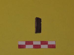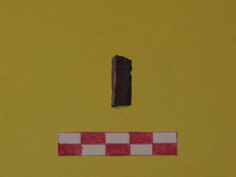 Lamella a sezione trapezoidale in selce di colore marrone-rossastro. Residui del cortice su uno dei margini.