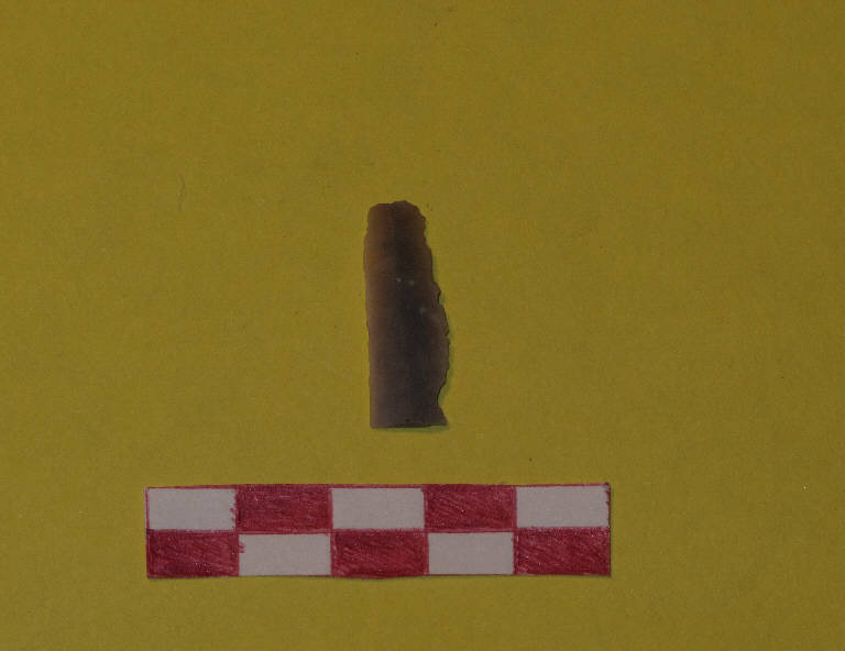 Lamella in selce di colore grigio, a sezione triangolare.