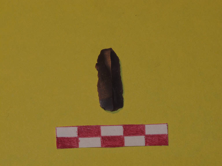 Lamella in selce di colore marrone scuro, a sezionetriangolare-trapezoidale.