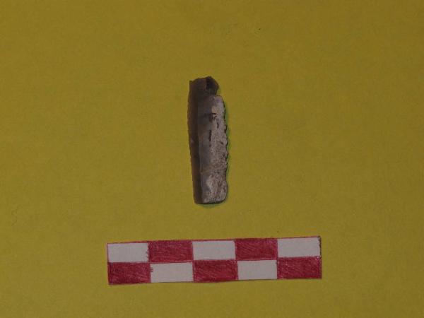Lamella in selce di colore grigio, a sezione trapezoidale. Residui di cortici lungo un margine.