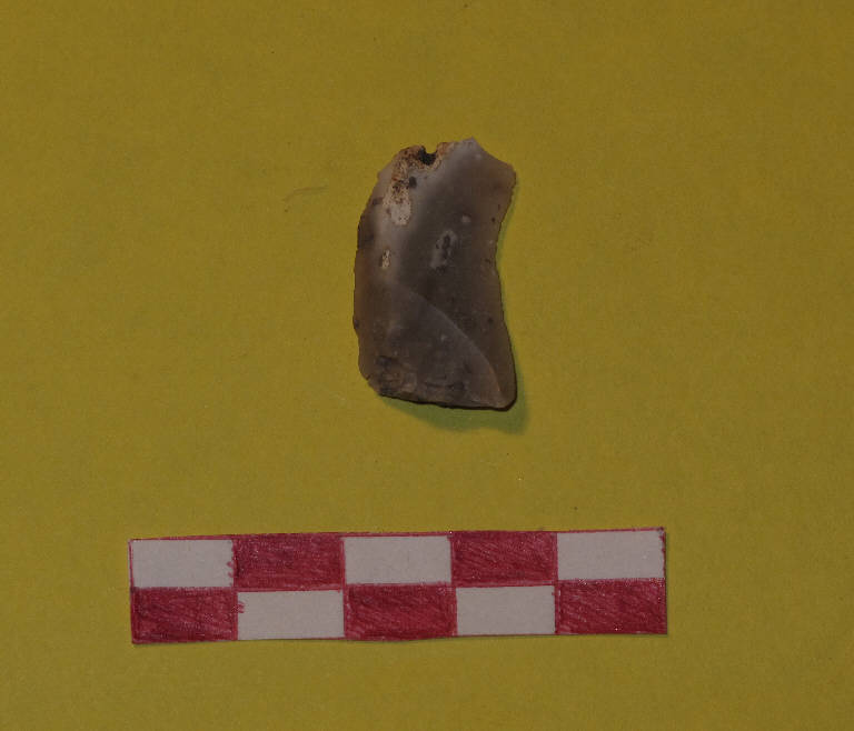 Scheggia laminare in selce di colore grigio, sezione triangolare molto irregolare. Residui di cortice in prossimità di un'estremità.