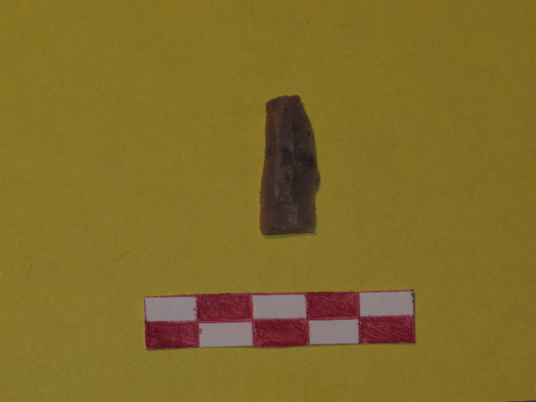 Lamella in selce di colore beige, a sezione trapezoidale-ellittica. I margini convergono verso un'estremità.