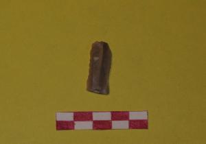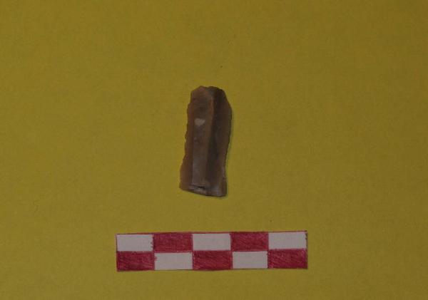 Lamella in selce di colore beige, a sezione trapezoidale. Ritocco marginale sinistro diretto e inverso, solo sulla parte centrale del margine.