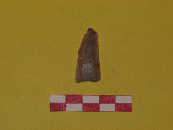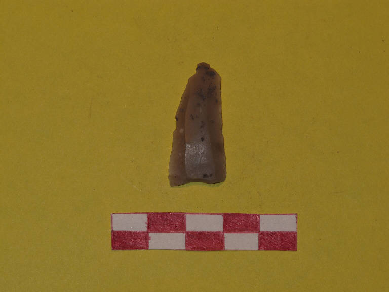 Lamella in selce beige, a sezione trapezoidale. I margini sono convergenti verso una delle estremità.