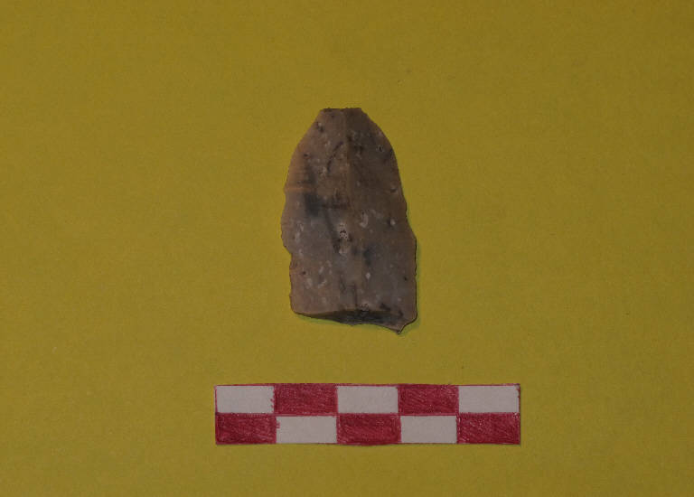 Lama a sezione triangolare, in selce di colore beige, con floculi bianchi. Troncata all'estremità distale.