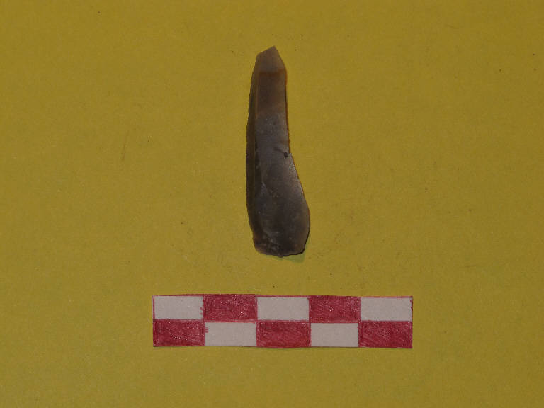 Lamella in selce di colore grigio, a sezione triangolare-trapezoidale. Integro.