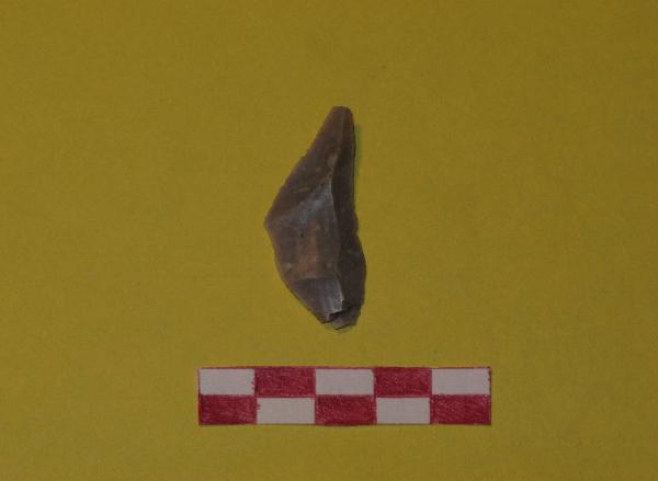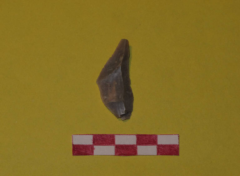Scheggia di selce di colore grigio, con floculi bianchi, a sezione triangolare. Profilo trapezoidale irregolare. ritoccata sul lato breve in prossimità dell'estremità distale. Ritocco marginale inverso.