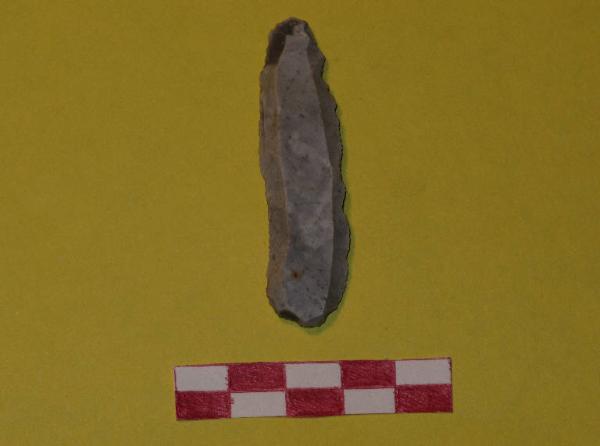 Grattatoio frontale su lama, in selce di colore grigio chiaro, a sezione trapezoidale. Estremità distale con ritocco erto; ritocco marginale diretto destro distale; ritocco marginale sinistro discontinuo. Integro.