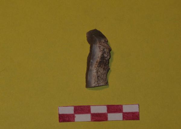 Scheggia in selce di colore grigio, a sezione trapezoidale-triangolare irregolare, con resti di cortice sul margine sinistro. ritocco denticolato sul margine destro. Integro.