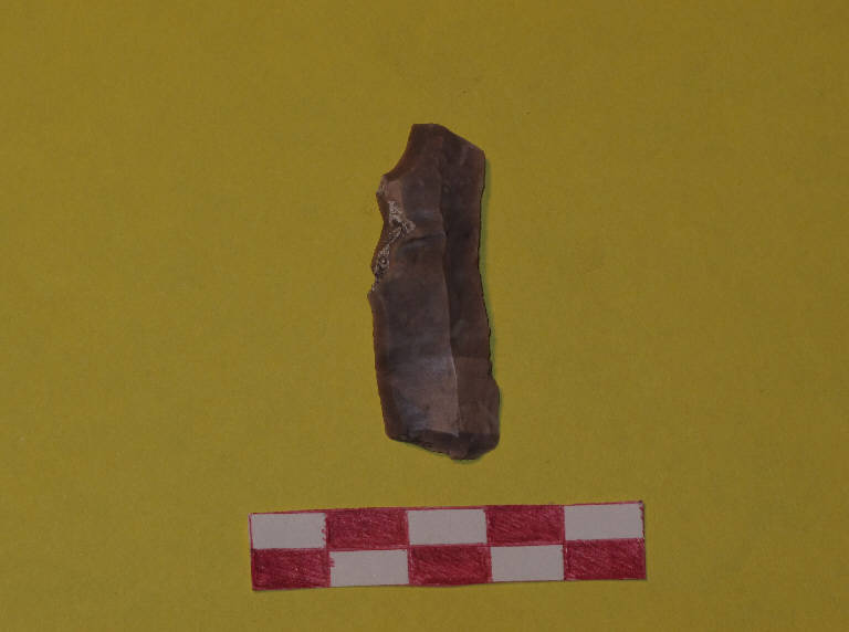 Lama in selce di colore marrone rosato, a sezione trapezoidale. Resti di cortice lungo un margine. Integro.