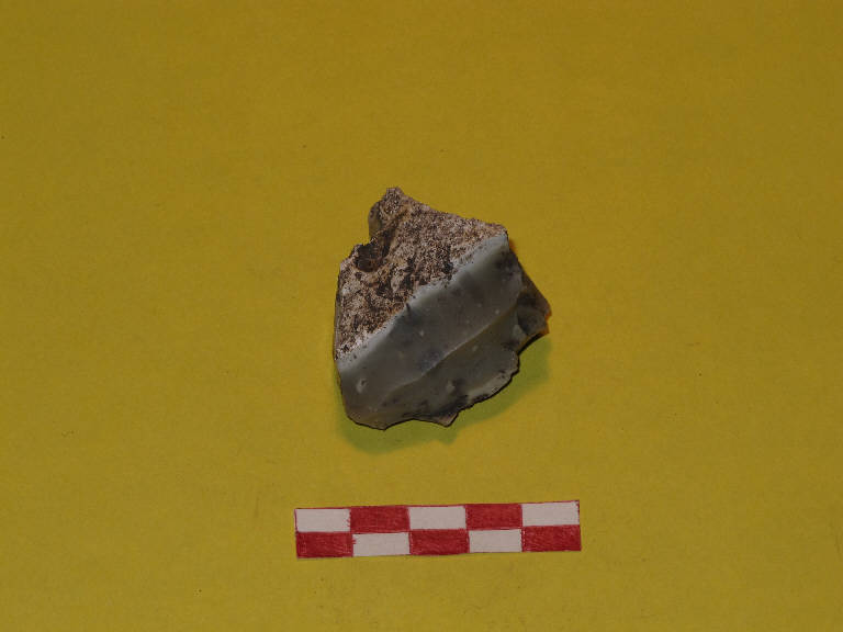 Nucleo piramidale in selce di colore grigio chiaro, a un piano di stacco. Resti di cortice su una superficie. Integro.