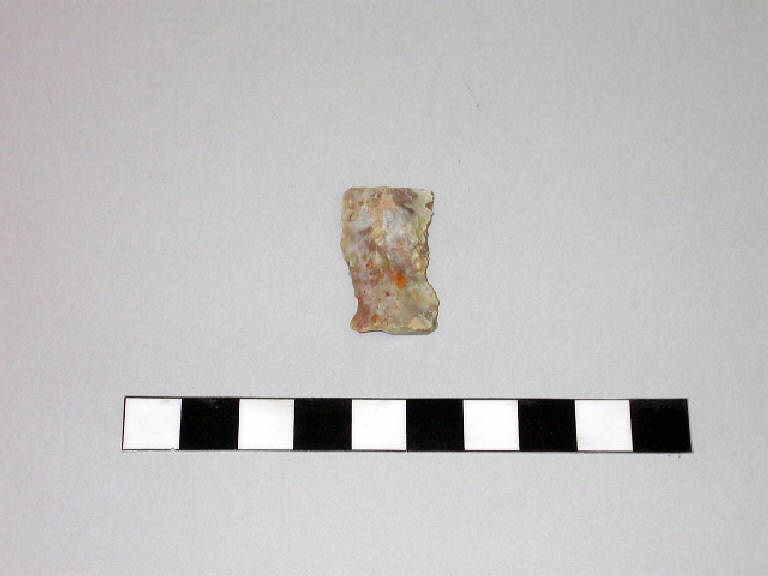 Lamella in selce color grigio con macchie rosso-rosa.