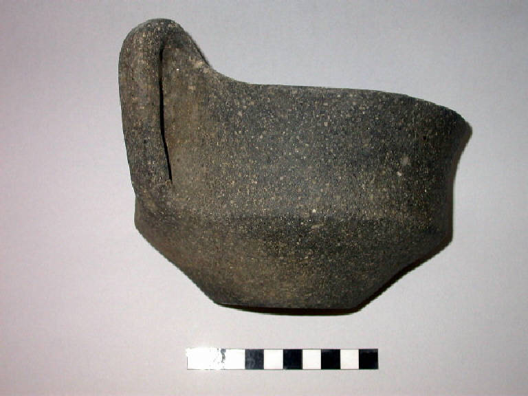 Tazza carenata, prodotta con cramica di impasto grossolana color grigio scuro, con orlo lievemente estroflesso, fondo piano e ansa a bastoncello sopraelevata sull'orlo.