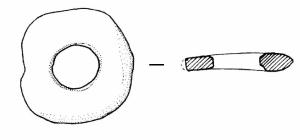 Profilo irregolarmente circolare a bordi assottigliati. Largo foro centrale del tipo a "clessidra".