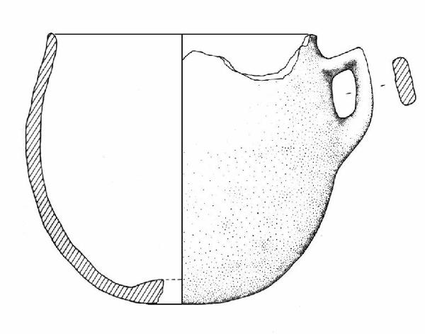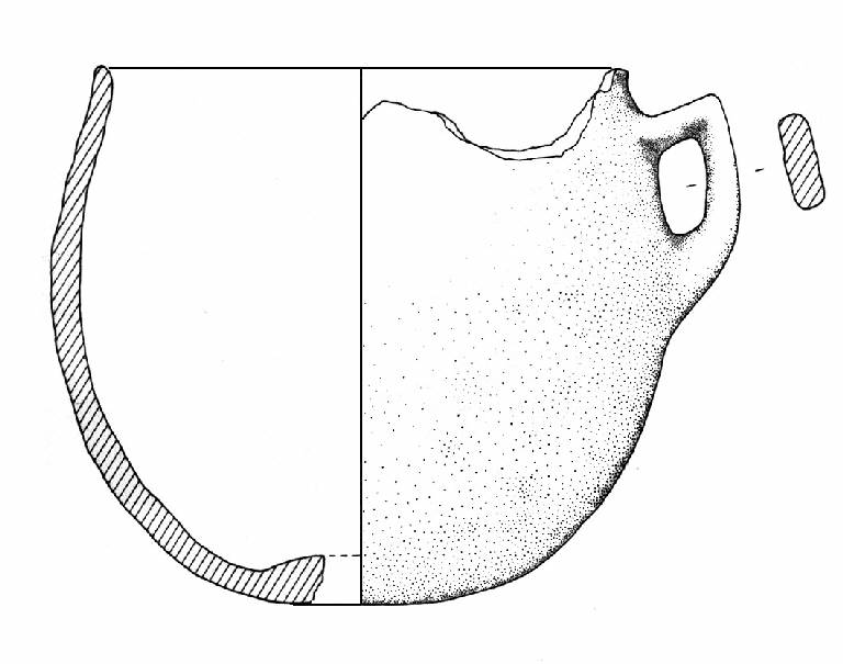 Grandi dimensioni, corpo globoso. Ansa nastriforme a gomito impostata dalla gola al diametro massimo. Colore: grigio scuro.