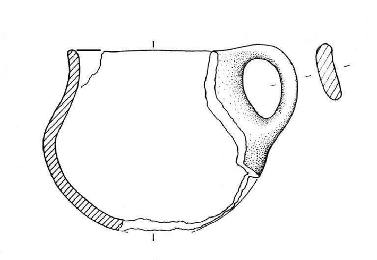 Orlo di forma arrotondata. Ansa nastriforme ad anello impostata all'orlo e lievemente sopraelevata. Colore nero.