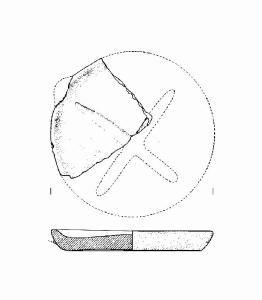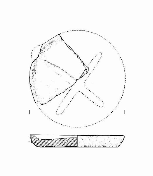 Orlo arrotondato con una lacuna in corrispondenza di un probabile attacco per una presa a linguetta; breve parete svasata; base leggermente concava. Sulla faccia interna due solcature ampie e tra loro perpendicolari delineano un motivo cruciforme. Colore: rosa-giallo.