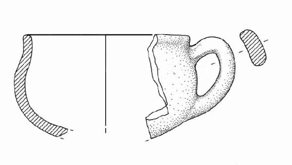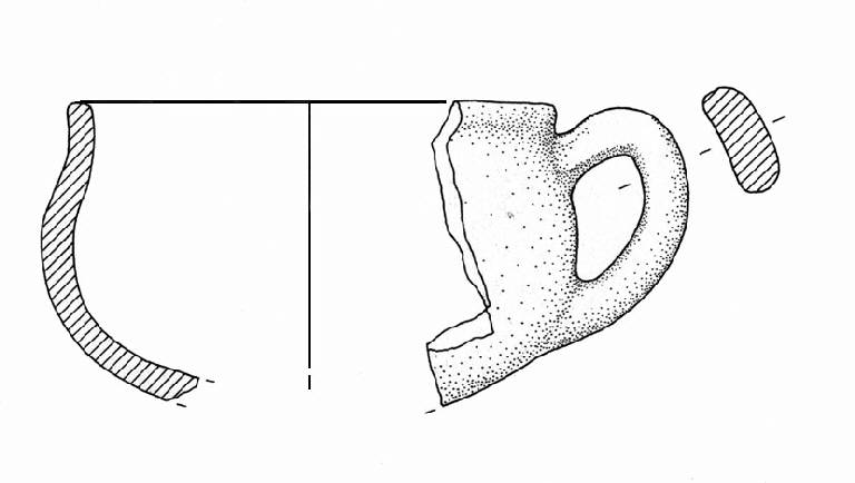 Orlo piatto, labbro rientrante a parete verticale, corpo globoso. Ansa ad orecchio a sezione nastriforme impostata dalla gola alla massima espansione. Colore: rosato.