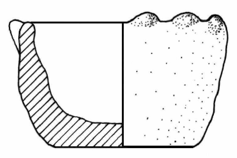 Corpo troncoconico. Orlo arrotondato, pareti convesse, fondo piano. Sull'orlo 11 bugnette. Colore: beige.