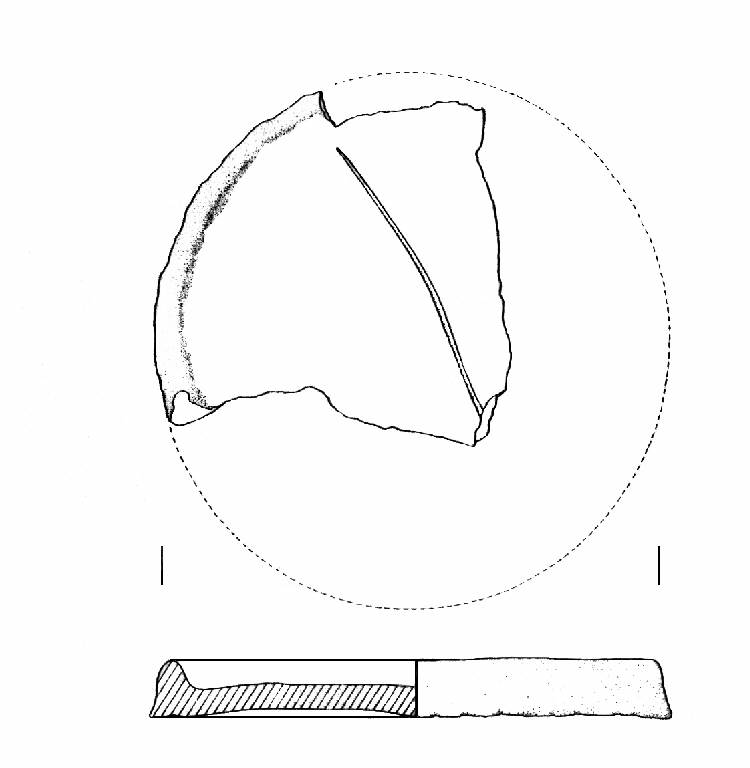 Orlo arrotondato, breve parete verticale, base leggermente concava. La faccia interna è decorata da una linea a graffito con andamento radiale. Colore: beige.