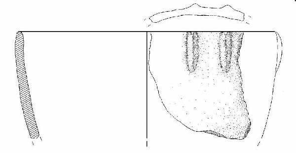 Orlo arrotondato, parete debolmente convessa. Due brevi cordoni plastici, a sezione triangolare, impostati sull'orlo. Colore: bruno.
