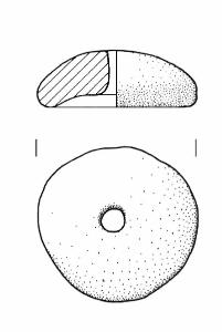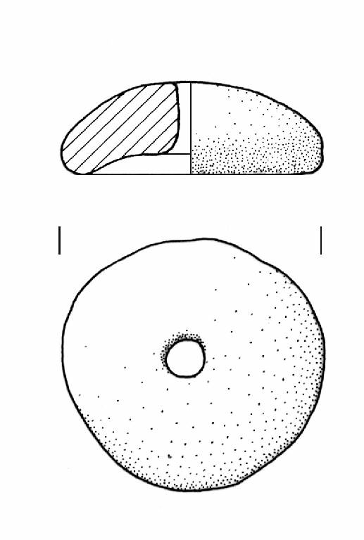 Corpo a calotta, base concava, foro mediano passante. Colore: grigio scuro.