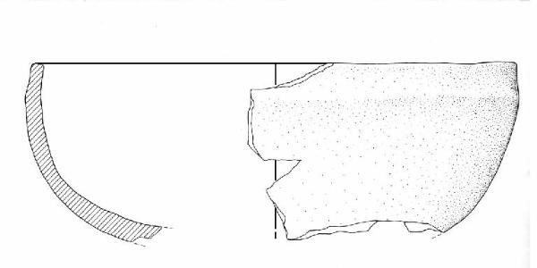 Orlo piatto, labbro leggermente distinto assottigliato e rientrante, vasca a calotta. Colore: grigio scuro con zone arrossate.