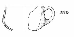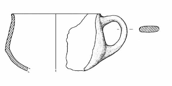 Orlo lievemente appiattito, parete distinta rastremata e rettilinea, vasca a calotta. Ansa a nastro verticale impostata subito sotto l'orlo e sulla carena. Colore: bruno-grigio.
