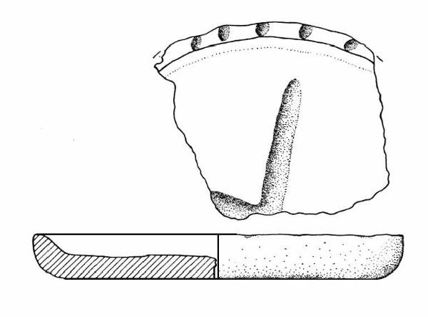 Orlo piatto decorato a impressioni digitali, parete rettilinea, fondo piano. All'interno motivo cruciforme ottenuto a solcatura. Colore: beige.