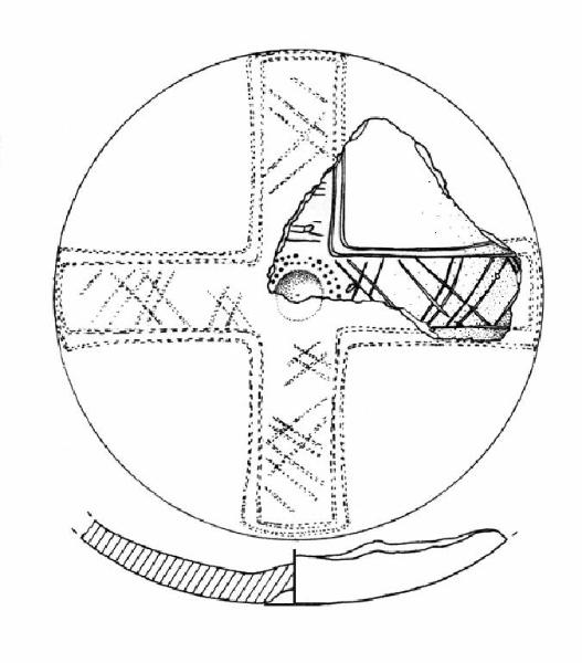 Ombelicatura marginata da una doppia banda punteggiata. vasca decorata da un motivo a croce realizzato a incisioni. I bracci della croce, tra loro ortogonali, sono delimitati da due sottili sochi paralleli e sono campiti da motivi a reticolo o da gruppi di tre linee incise parallele. Colore: grigio-beige.