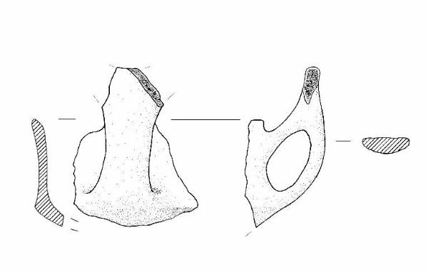 Orlo di forma arrotondata; parete distinta svasata, lievemente concava, vasca a calotta. Ansa probabilmente del tipo ad ascia a sezione nastriforme. Colore: marrone grigio scuro.