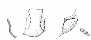 Orlo di forma arrotondata, estroflesso, parete distinta svasata leggermente concava, carena a spigolo piuttosto pronunciato, vasca a calotta. Ansa nastriforme sopraelevata con appendice asciforme a margine superiore rettilineo. Colore: grigio chiaro.