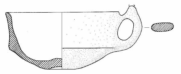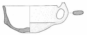 Orlo di forma arrotondata, lievemente obliquo verso l'interno; parete distinta lievemente concava; vasca a calotta; fondo con andamento piano-concavo. Ansa nastriforme con appendice asciforme. Colore: beige.