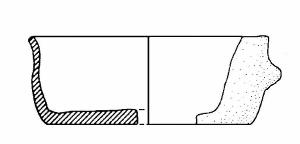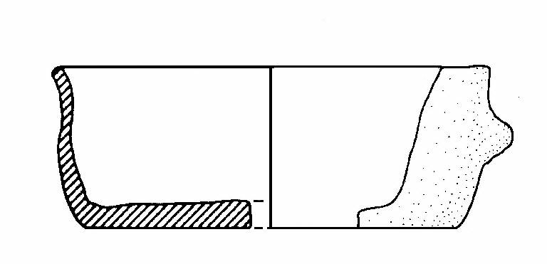 Orlo di forma arrotondata, lievemente esoverso, profilo sinuoso; fondo piano. A circa metà della parete bugnetta conica. Colore: marrone.