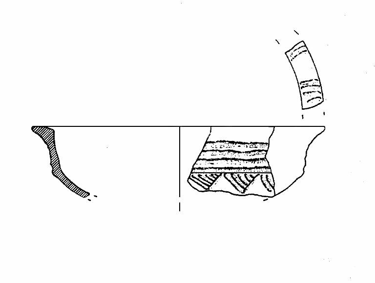 Corpo carenato. Orlo di forma arrotondata ingrossato ed esoverso decorato a solcature; parete distinta lievemente concava, svasata decorata a fasci di solcature orizzontali; vasca a calotta decorata a denti di lupo riempiti a tratteggio. Colore: marrone grigio molto scuro.