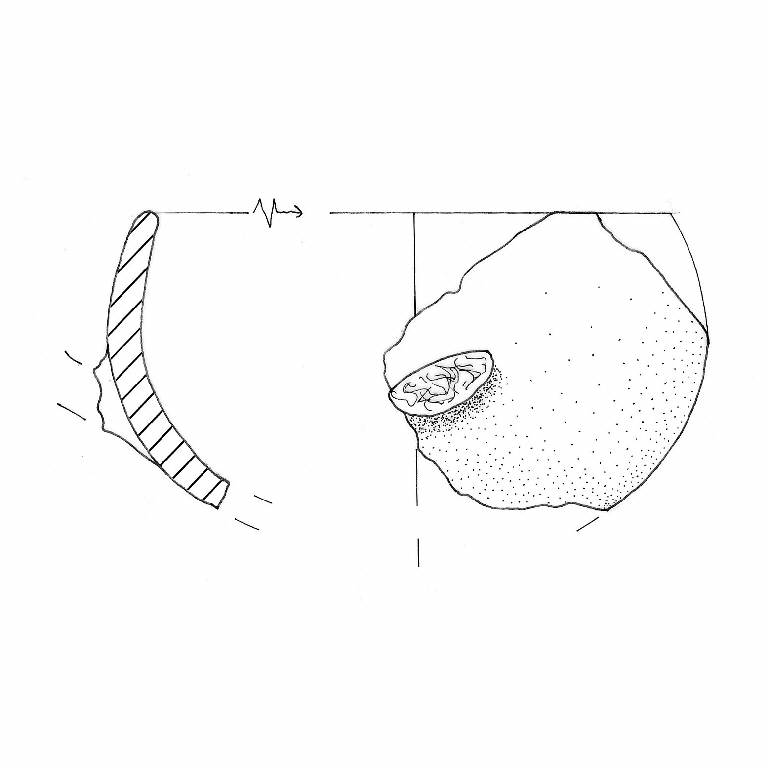 Orlo di forma arrotondata obliquo verso l'interno. Ansa nastriforme impostata obliquamente. Colore:grigio molto scuro.