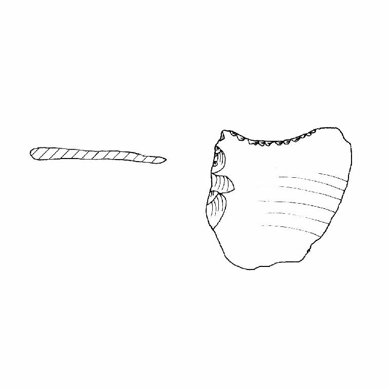 Grattatoio frontale, ritocco erto inverso. Sezione appiattita. Superficie lucida. Colore bruno rosso 5YR4/4.