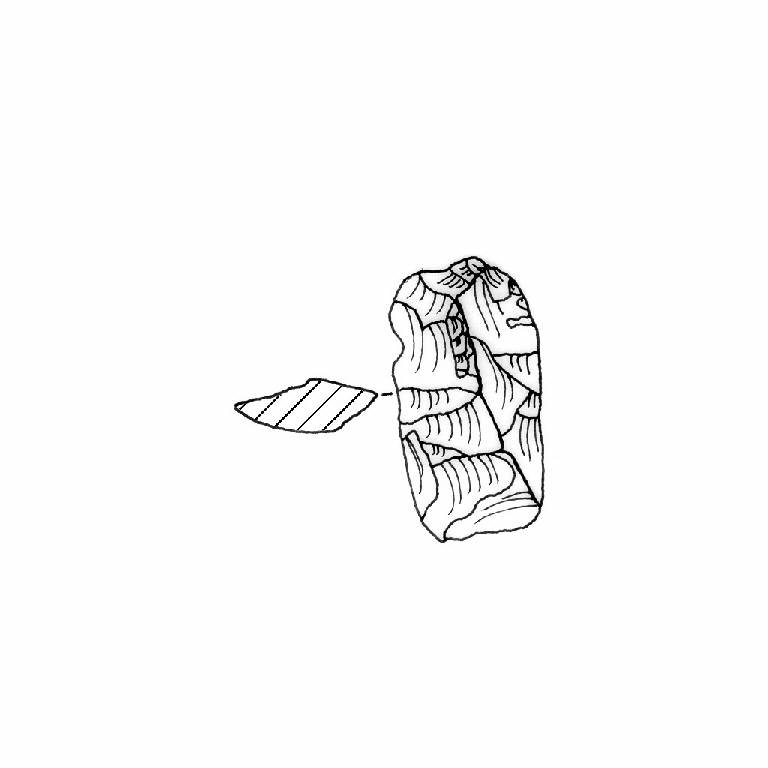 Grattatoio ritocco piatto, coprente bifacciale grossolano. Margini laterali convergenti al basso, base rettilinea, margine superiore arrotondato. Sezione covessa. Superficie lucida screziata. Colore giallo oliva 2,5Y6/8 bruno vivo 2,5YR5/8.